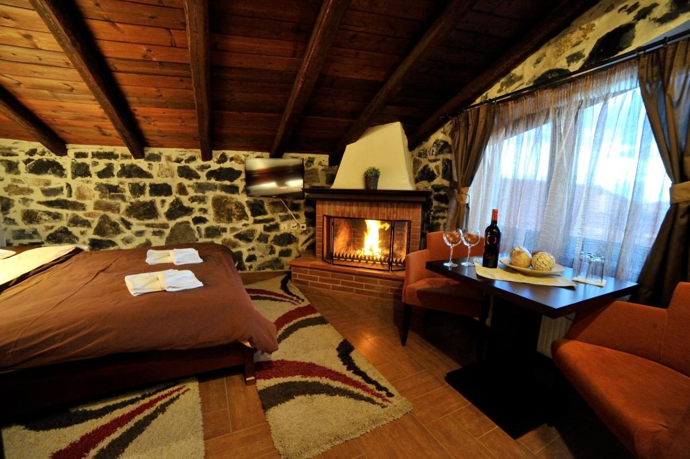 Deluxe Room. The fireplace is a top feature of this double room. Featuring free toiletries, this double room includes a private bathroom with a shower and slippers. The double room features a flat-screen TV with cable channels, a private entrance, a wardrobe, a tiled floor as well as mountain views. The unit has 1 bed. ;
